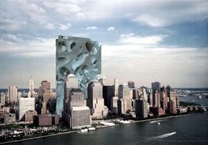 Perhaps most amusing was Acconci’s commentary on the most recent phase of his career working as part of an architectural co-operative. Acconci turned to architecture because he was already treating galleries and museums as public spaces, but realized “who was I kidding – a gallery or a museum is never going to be a public space!”  Among his architectural projects, which remain largely unbuilt, is a proposal for the new World Trade Center.  The building is full of holes, a pre-exploded skyscraper.  “A terrorist looks down and thinks to himself ‘We don’t need to bother with that one!  It’s already been dealt with!’”  Cheeky, yes, but the schematics were actually quite mesmerizing, with public garden spaces intermixed in the gaps of the building, turning the notion of a private building with a public front plaza on its head.