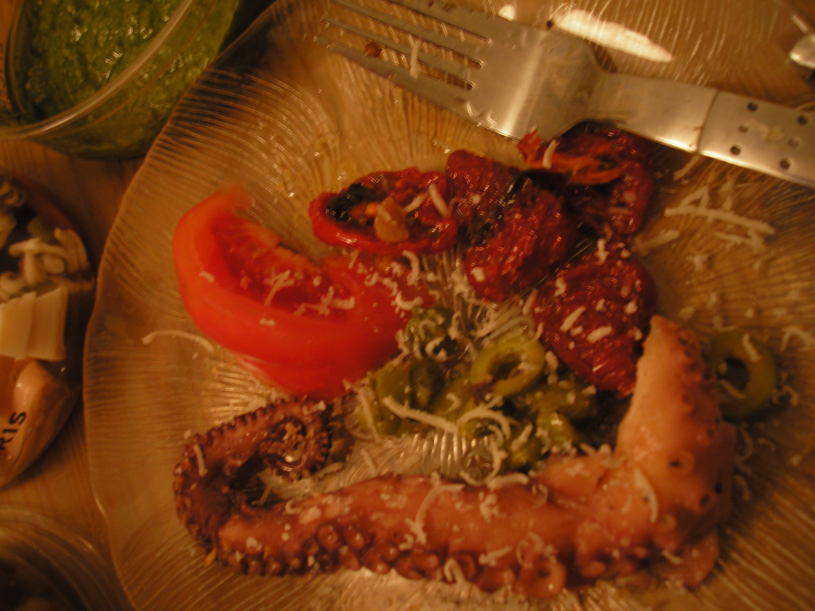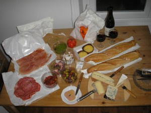 A was the best possible companion to have in this shopping adventure. After an initial investigatory lap of the store, we got to work purchasing a truffle-infused foie gras, paper-thin slices of San Daniele prosciutto and aged Milano salami, five gorgeous cheeses (Tomme de Savoie, Roquefort Papillon, Brillat-Savarin brie, Morbier, and Parmigiano-Reggiano), a cold seafood salad of squid, mussels, and crab meat with roasted peppers, octopus with green olives and giant capers, semi-sechées tomatoes, a sublime pesto, spicy Moroccan olives, a big bag of super-sweet clementines, and two traditional baguettes. For wine, we picked out a lovely Sancerre and an even lovelier Gigondas. Oh, and two perfect tartes aux citrons for dessert.