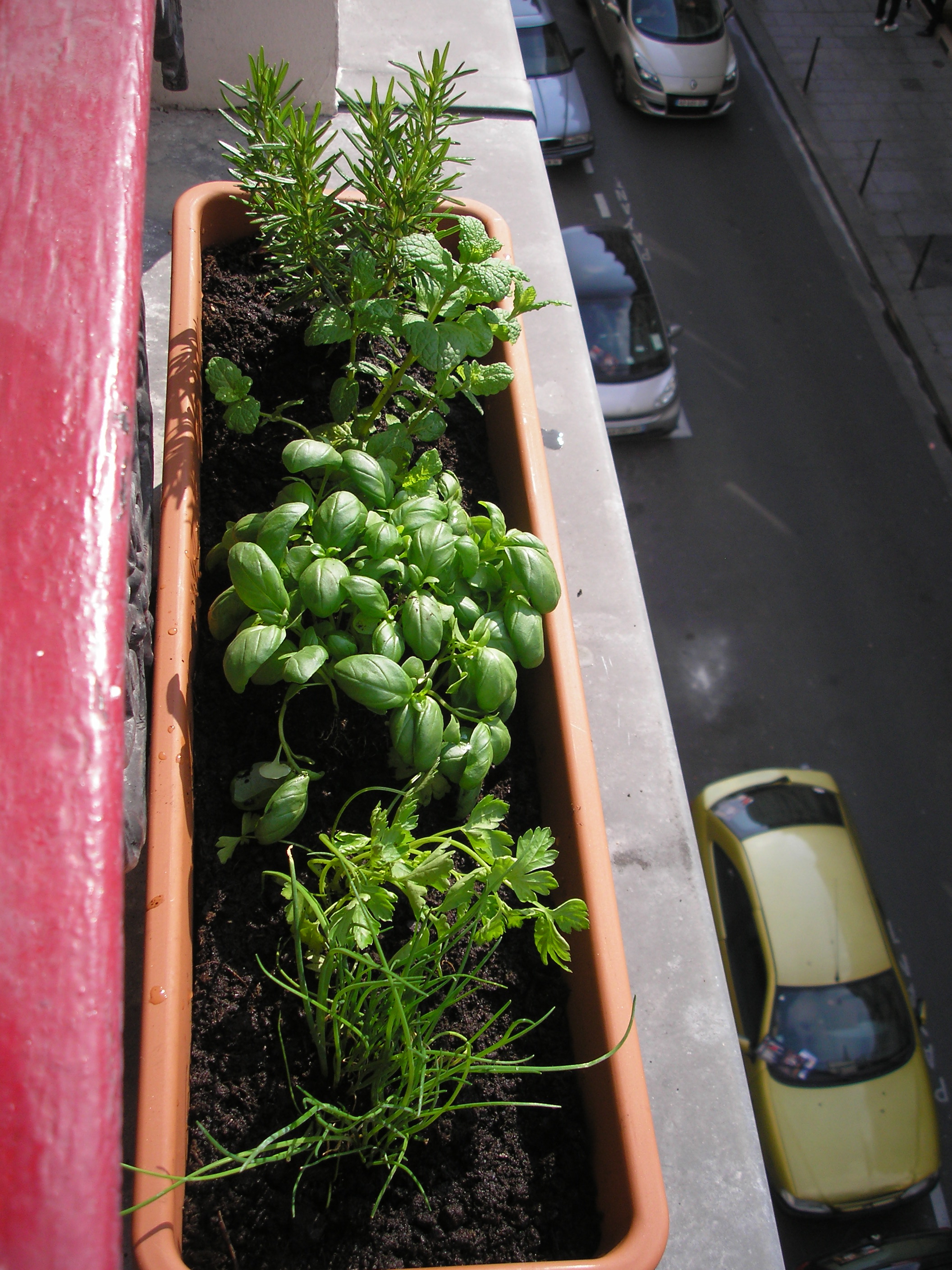 My new windowbox full of yummy herbs (from the top, that’s rosemary, Moroccan mint, basil, Italian parsley, and chives).
