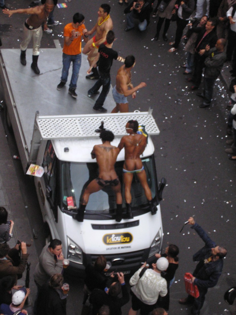 I had grand plans that of getting a good night’s sleep before our flight, but that was thrown out the window when I noticed that Raidd Bar had erected a giant soundsystem and rack of spotlights, strobelights, and confetti-expelling machines on the street by mid-afternoon the day before we left.  I gradually realized that it was Fête de la Musique, a day in Paris where music is played outside everywhere. While this originally meant that there would be various kinds of pleasant folk music played in the streets, Raidd Bar has apparently turned it into an annual, pre-Pride street block party extravaganza.  By 8 p.m. or so the street beneath my apartment looked like this: