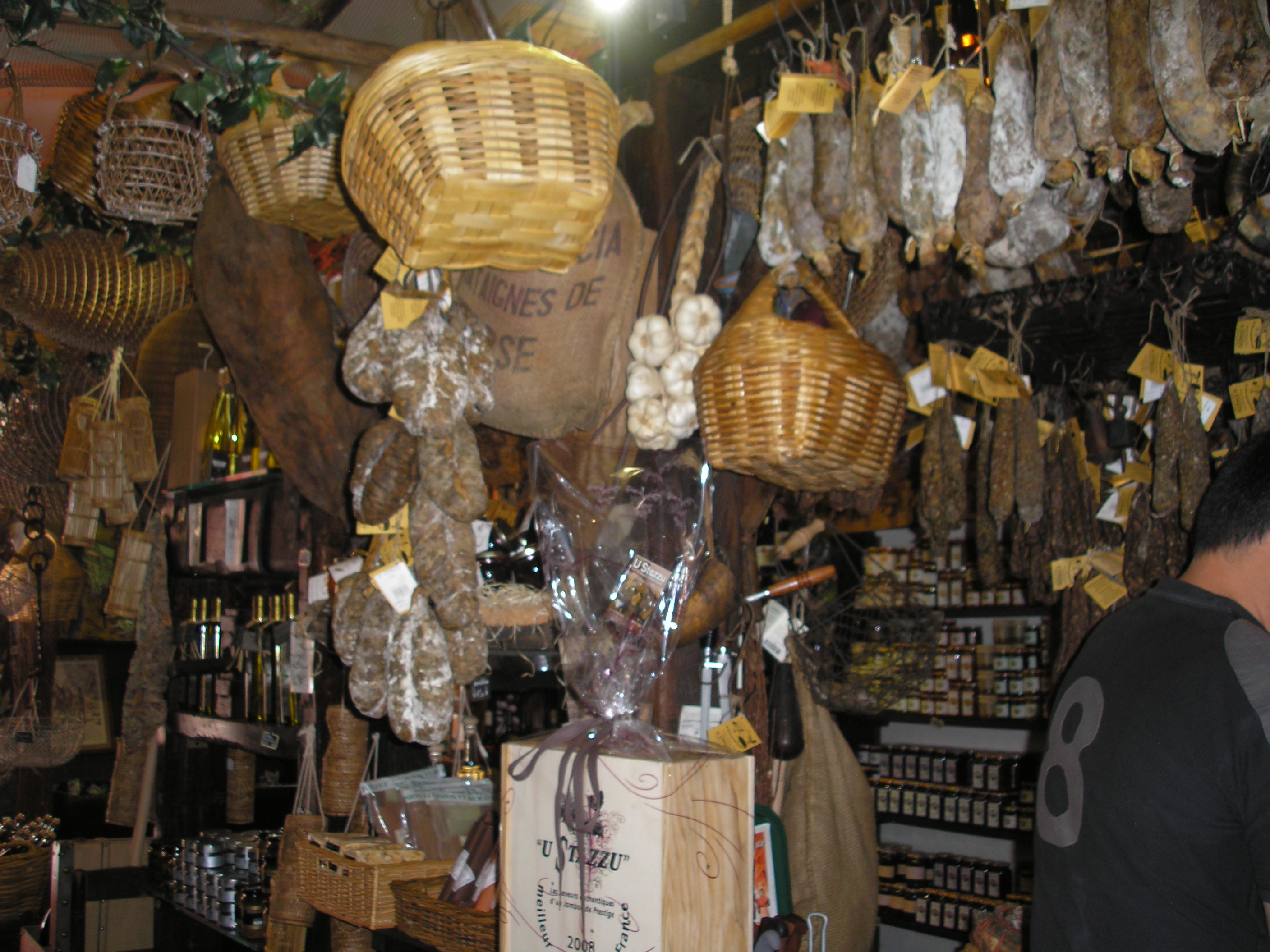 Exhausted after only a few hours sleep (let’s just say that nobody wanted the party to end on my block that night), we arrived in Ajaccio after an exceptionally unstressful flight from Paris. We only spent 24 hours there, but we managed to cram in lots–a pretty comprehensive survey of Corsican cuisine. We passed the first travel-compatibility test admirably when we both took one look at the long line of hot and haggard tourists waiting outside of the Napoleon Bonaparte’s house of birth, shook our heads, and decided to get lunch instead.  The destination:  U Stazzu (1 rue Bonaparte), a shop that sells award-winning charcuterie, cheese, and other Corsican delights.  Here is a furtively shot picture of their vaguely cavernous interior: