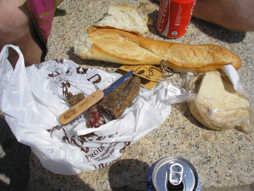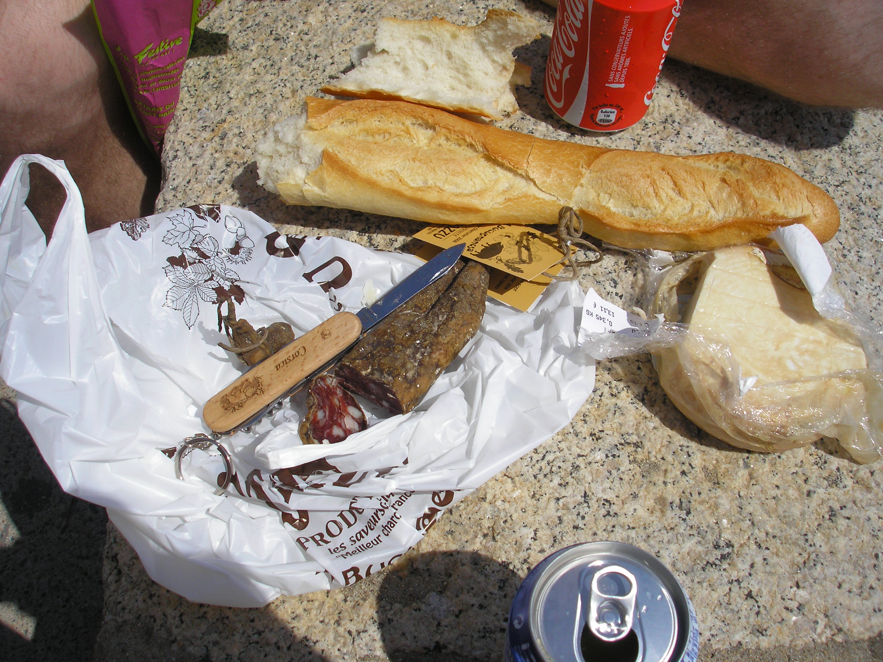 After sampling their glorious products, all of which were explained by a very helpful saleswoman, we purchased a smallish salamu (6€) and a round of Bastelicaccia cheese (12€), a slightly sharp, slightly crumbly, altogether perfect sheep’s milk cheese.  Next stop was Boulangerie Galeani (3 rue du Cardinal Fesch), a four-generation old artisinal bread and pastry shop that specializes in Corsican baked goods (more to come on that subject). We picked up a baguette and made a mental note to return there for breakfast the next day.  A quick dash into a souvenir shop for a pocket-knife adorned with the Moor’s head that is the symbol of Corsica and we were ready to sit on the sea wall and eat our feast.  B proved himself to be an able knife-wielder: