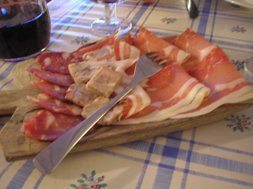 S and H—as well as Anthony Bourdain and every other travel food writer under the sun—had raved about the Sardinian agritourismos: small farms that offer up locally-grown regional specialties and simple accommodations.  We had made reservations at one such agritourismo, the Azienda Agrituristica Guthiddai (S.P. Nuoro Dorgali Bivio Su Gologne) for dinner. We arrived to a virtually empty dining room and a staff that seemed eager to set us up for the evening.  We settled in to our table and murmured some nonsense to one another about the menu or how much this thing was going to cost us. Water was brought out, as was a jug of the house rosso made with local Cannonau grapes. It quickly became clear that we were just along for one hell of a ride.