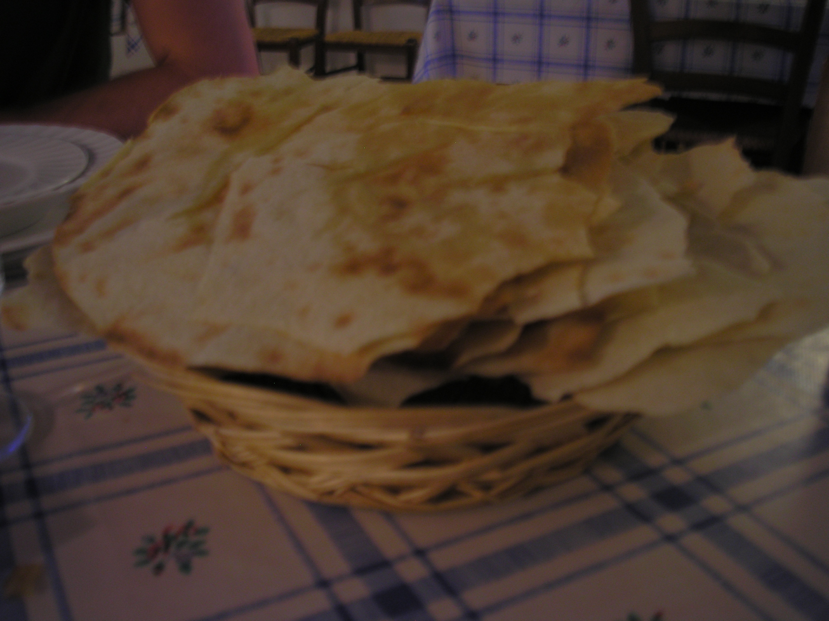 First up was the pane carasau, a crisp flatbread that is the basis of much of Sardinian cooking. It was drizzled lightly with the Guthiddai’s own olive oil, made from olive trees we could see out the window. Like greedy Americans faced with a bottomless basket of chips and salsa at a Mexican restaurant, we ate way too much of this before our meal.
