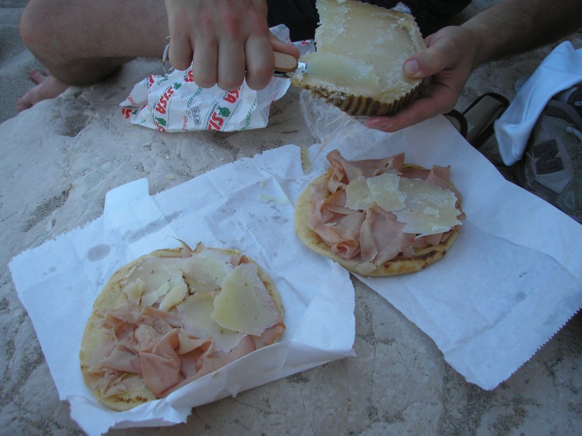 On the way, we stopped in the small town of Dorgali, which is very similar to Oliena in its lack of tourist infrastructure. We found an unremarkable supermarket, where we nevertheless spent a good half hour or so cooing at the various regional offerings. Is there anything better than exploring a supermarket in a foreign country? I can skip the most important national monuments entirely if it means that I can hang out in the canned fish, cheese, or deli sections of a European supermarket for an hour or so. After carefully considering our picnic options, we bought some sliced Sardinian mortadella, a wedge of Pecorino cheese, and some beautiful foccacia-like spongy flatbreads. Travel is an excellent way to get to know more about somebody, and one of the things I discovered about B is that this guy has an almost elemental love of mortadella – which, let’s be honest, is basically the boloney of the Italian deli counter. But even I had to admit that Sardinian mortadella looked like something special, with big peppercorns and pickles buried in the enormous round of pressed meat. The Pecorino recommended by the woman at the deli counter was pretty young, as it could be easily sliced with our amazing pocketknife, which had proved itself time and time again on the trip.