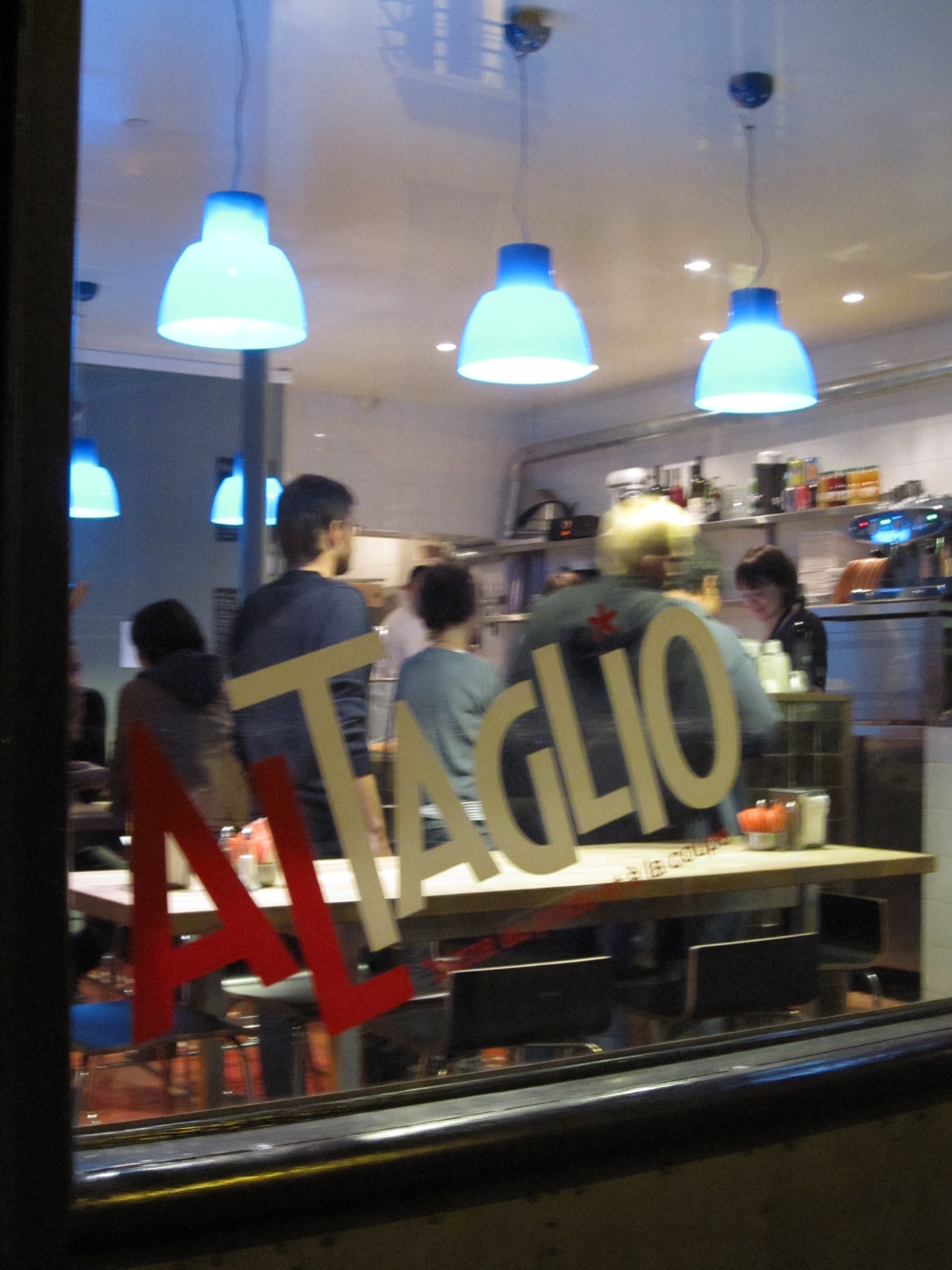 So anyway, these new folk along with B, M, and I (ha! system double fail!) all converged on Sunday night at Al Taglio (2 bis rue Neuve Popincourt, 75011 Paris, Métro Oberkampf), a pizza place that I had been lustily reading about in Le Fooding for months.  By now you must realize, dear reader, that I am a pretty devoted pizza-eater, and my allegiances have been torn by the deep excellence of both La Briciola and Pink Flamingo Pizza, both of which are within walking distance of own apartment  and make me quiver with desire.  I hardly expected that Al Taglio (which means “by the slice”) could possibly compete with my already over-full dance card of Right Bank pizza joints.