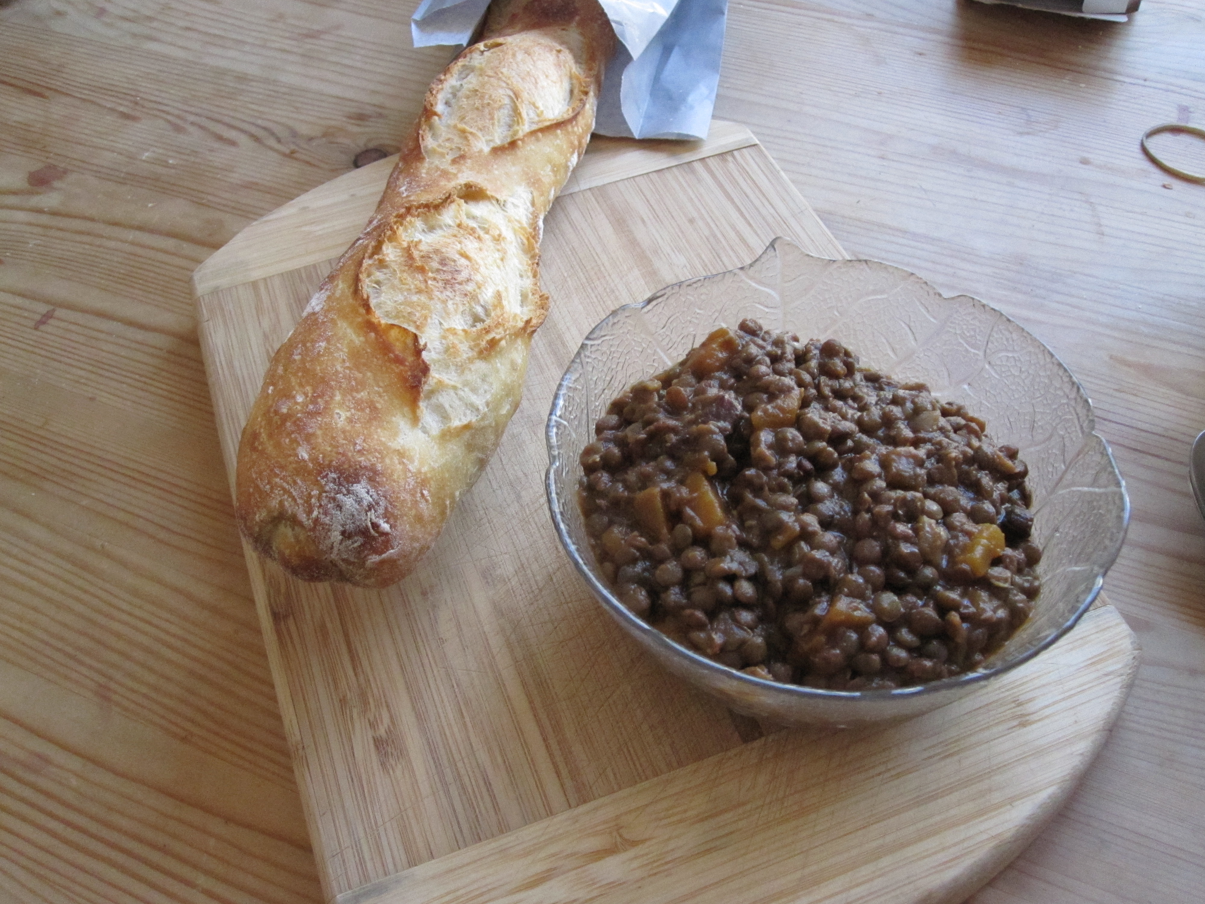 You see lentils and you think “healthy,” right?  Wrong!  I mean, I guess these are healthy in an abstract sense, but like most things in my life they actually contain a lot of pork fat and booze.  Surprise, surprise!  But they are seriously delicious, and get increasingly so if you make enough for leftovers.  They are easy and a hearty dinner in their own right, especially if you pair with some fresh bread (we buy our baguettes from the amazing Huré, 18 rue Rambuteau, Paris 75003, Métro Rambuteau, and will never pledge this kind of devotion to another bakery again) and a big green salad.