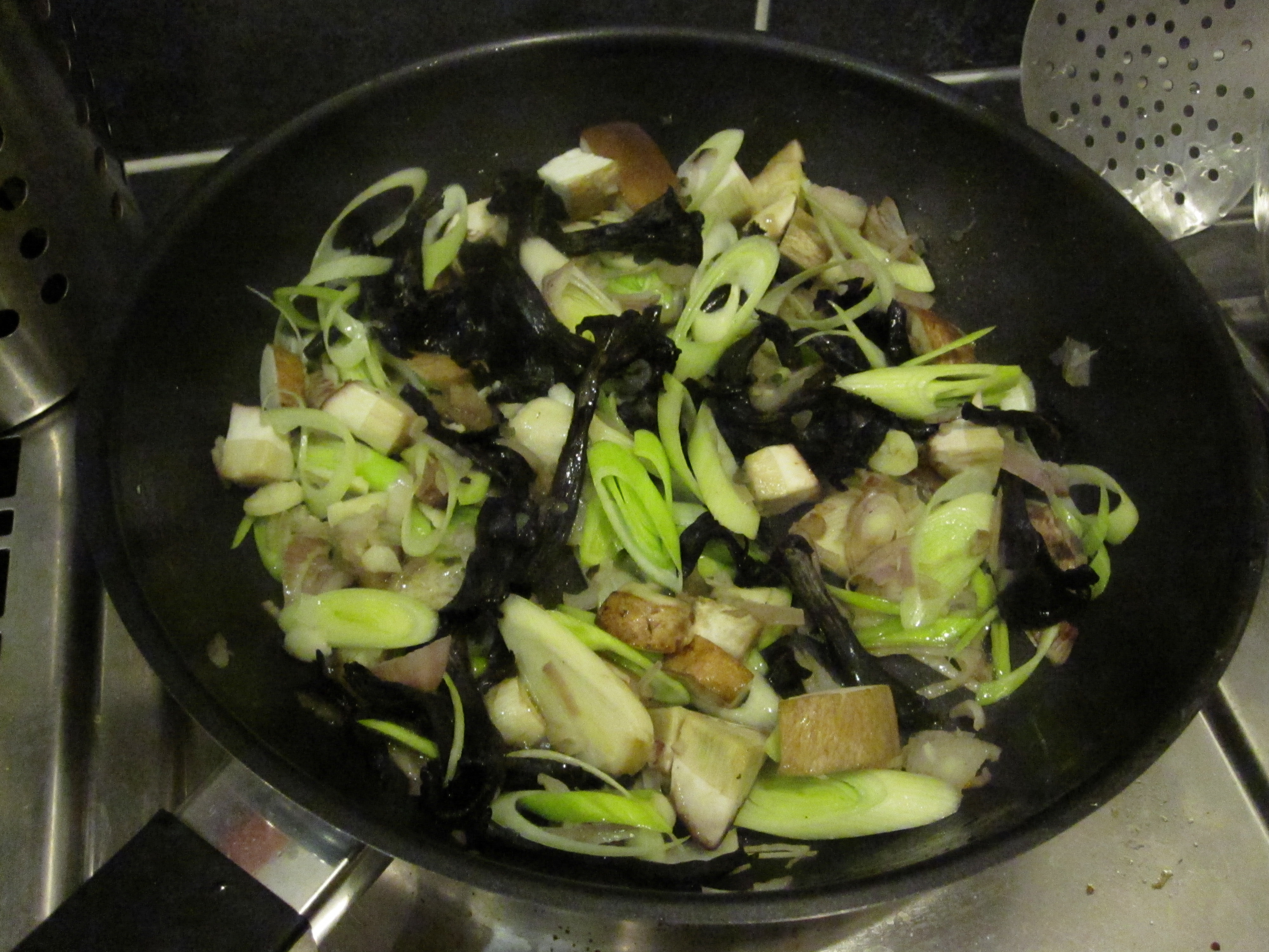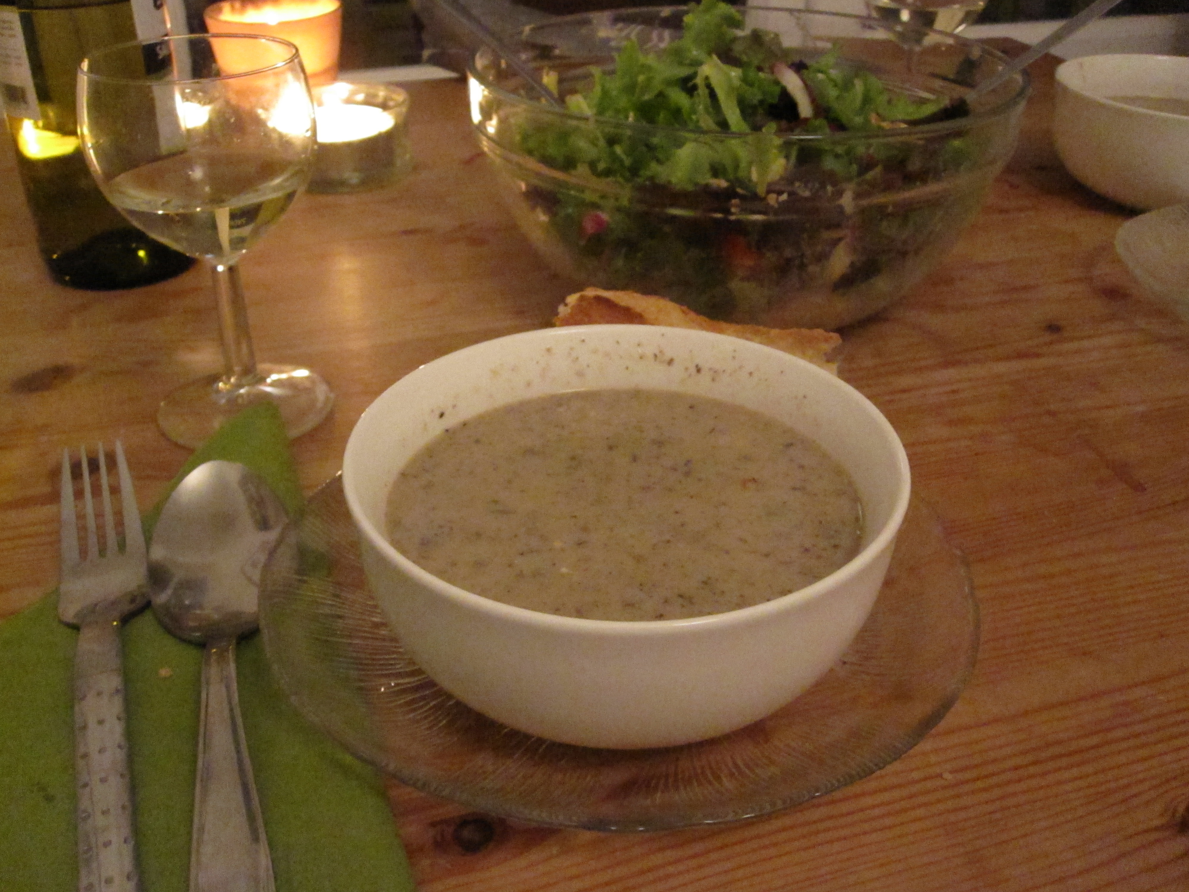 When slightly browned, sprinkle with flour and brown a bit further until it looks and smells really yummy (highly scientific, I know).  Once you have browned all of the leeks and two-thirds of your mushrooms, gradually put the mixture in the food processor, using chicken stock as a liquid to get things moving. You should be left with an paste, which you should add to a pot with equal parts white wine and chicken stock. In another frying pan, brown up the mushrooms you reserved. These will not be pureed and will give your soup some texture.