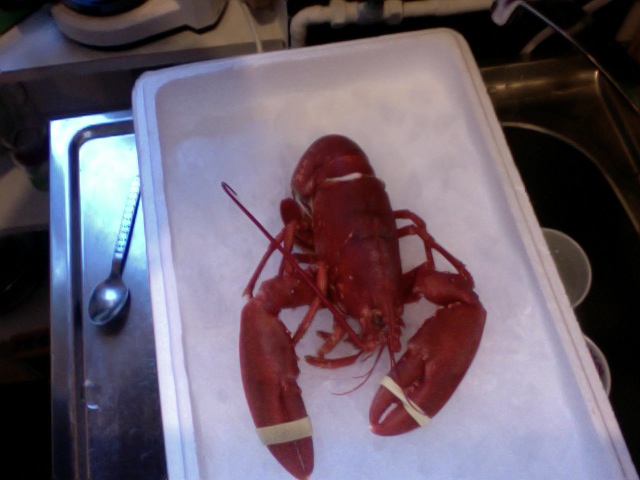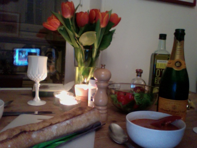 I came home to Sade and Stevie Wonder on the stereo, a perfect bouquet of orange tulips, a box of fancy chocolates, and fragments of lobster shell mysteriously shellacked to the walls of our kitchen. The bisque itself was a labor-intensive, resounding success. I often describe things as “sex on toast” (no idea where I got that one), but this was even better. It was like sex on a fresh blini. Always a stickler for the correct word, B explained that it less of a bisque and more of a chowder, as he decided to submerge a half-lobster’s worth of meat in each bowl upon serving (insert heaving sounds of joy here). He cobbled together his masterpiece from a mixture of French and English recipes, so I’ll try and convince him to give me the recipe to post here. There really is nothing like the slaying of a live animal to really let your lover know you care.