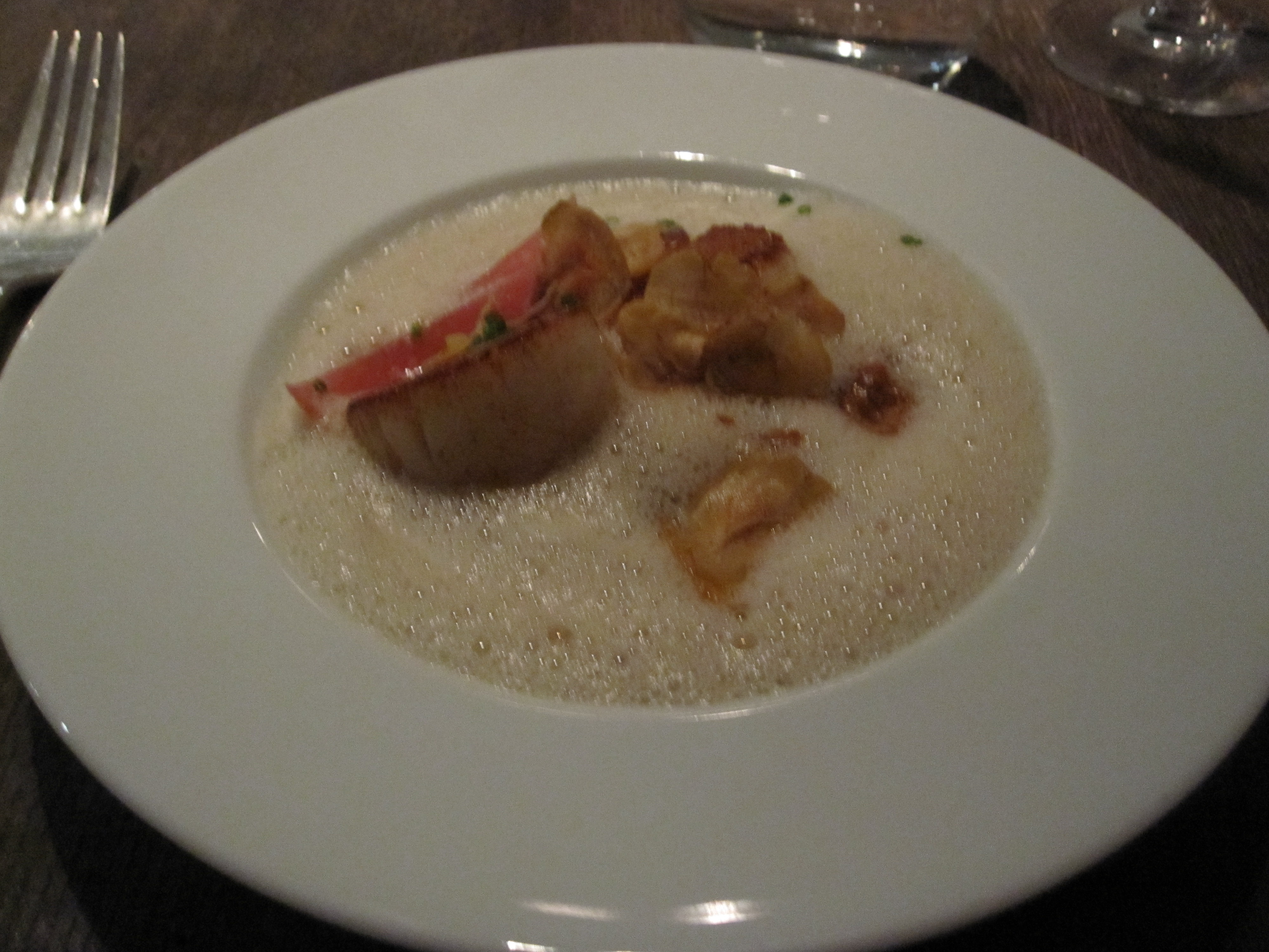 The renovations were well worth the wait – the space is quite fantastic if you are interested in watching expert chefs yield their knives. Like La Gazzetta and many of the best new restaurants in Paris run by young chefs, the menu changes on a daily basis and reflects the incredible diversity of seasonal ingredients available here in France. Our meal in January began with champagne and a single perfect oyster dressed with a fresh herb and soy vinaigrette. I expected the vinaigrette to overpower the oyster, but it instead brought out some of the green, salty notes that I might not have otherwise picked up on. That is to say I could have shot those bad boys all night long and been one happy camper. But instead we had to move on to a course of foie gras, served with house-pickled vegetables and a quince chutney. Then on to another noix de Saint Jacques (sea scallops) dish, this time in a chestnut and bacon foam, with both roasted chestnuts and crispy deep-fried chestnut slivers. As an unexpected pop of flavor, the dish was spiked with red cipolline onions. Heaven.
