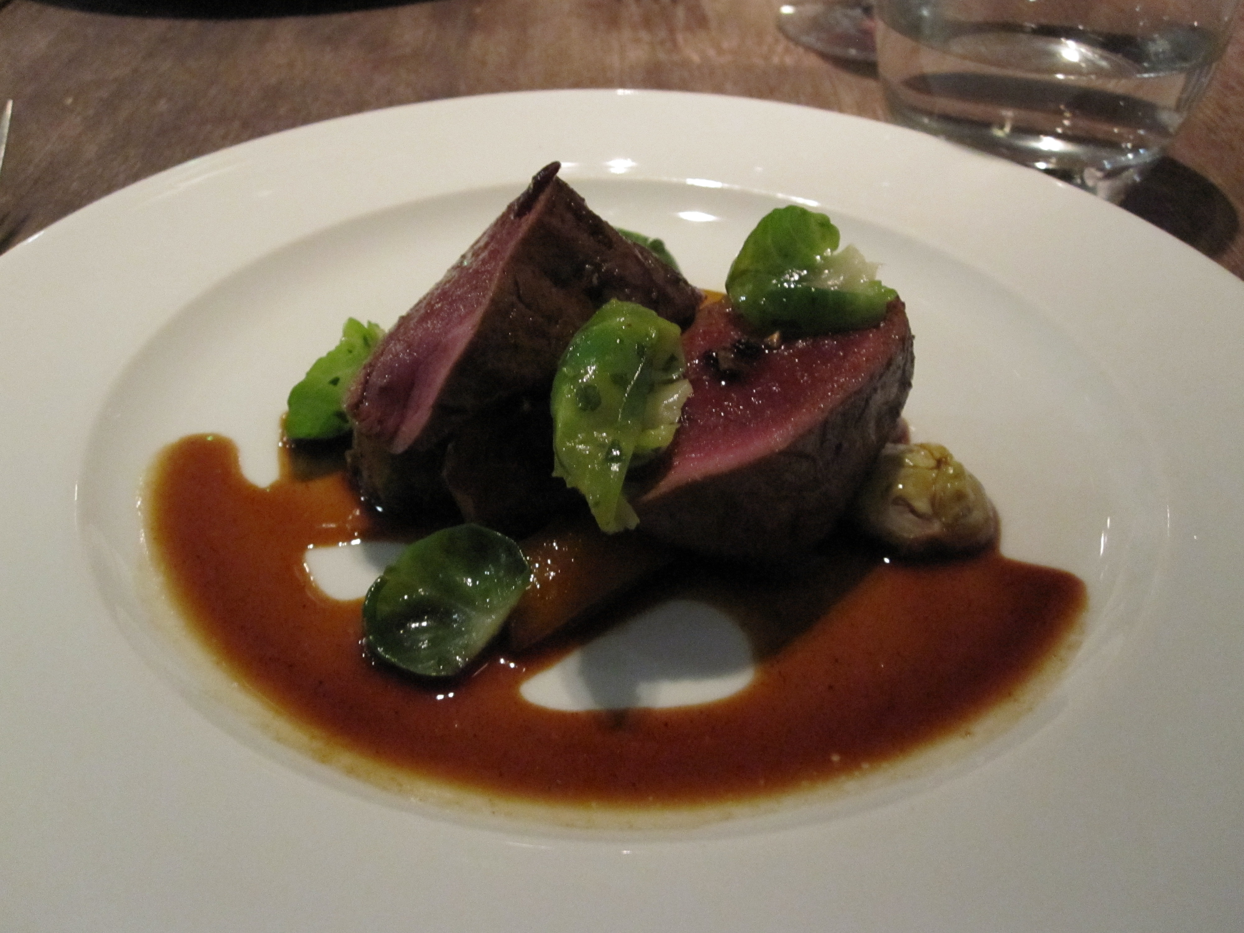The meat course was a perfectly cooked piece of venison served with both roasted brussel sprouts and tart, flash-fried brussel sprout leaves. Somehow M translated chevreuil as baby goat, so we ate this course assuming that was what we were eating. B kept insisting that his father’s venison tasted JUST LIKE this baby goat flesh and wasn’t that STRANGE? Then we went home and looked up what chevreuil actually means. It’s venison, fyi. And at Spring, it’s like buttah.