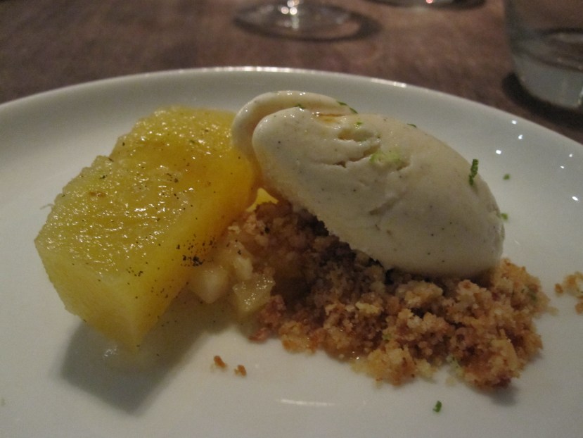 Finally we made it to a two-part dessert. First up was a piece of pineapple soaked in Japanese whiskey served with vanilla gelato and some kind of crushed cookie and lime zest…