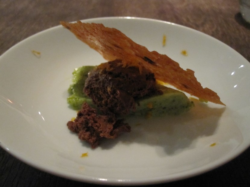 …followed by a pistachio ganache and chocolate mousse served with a smoky black tea wafer. I could happily spread that pistachio ganache over toast for the rest of my life.