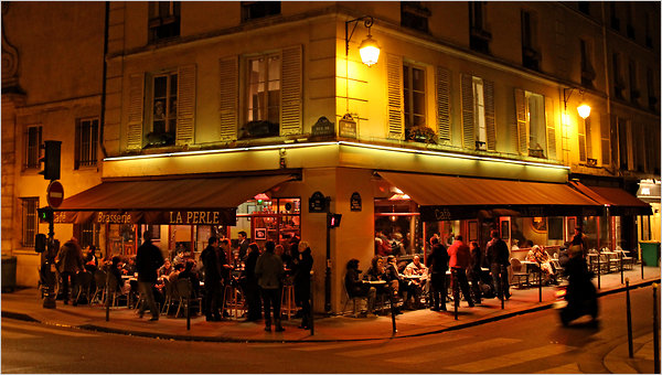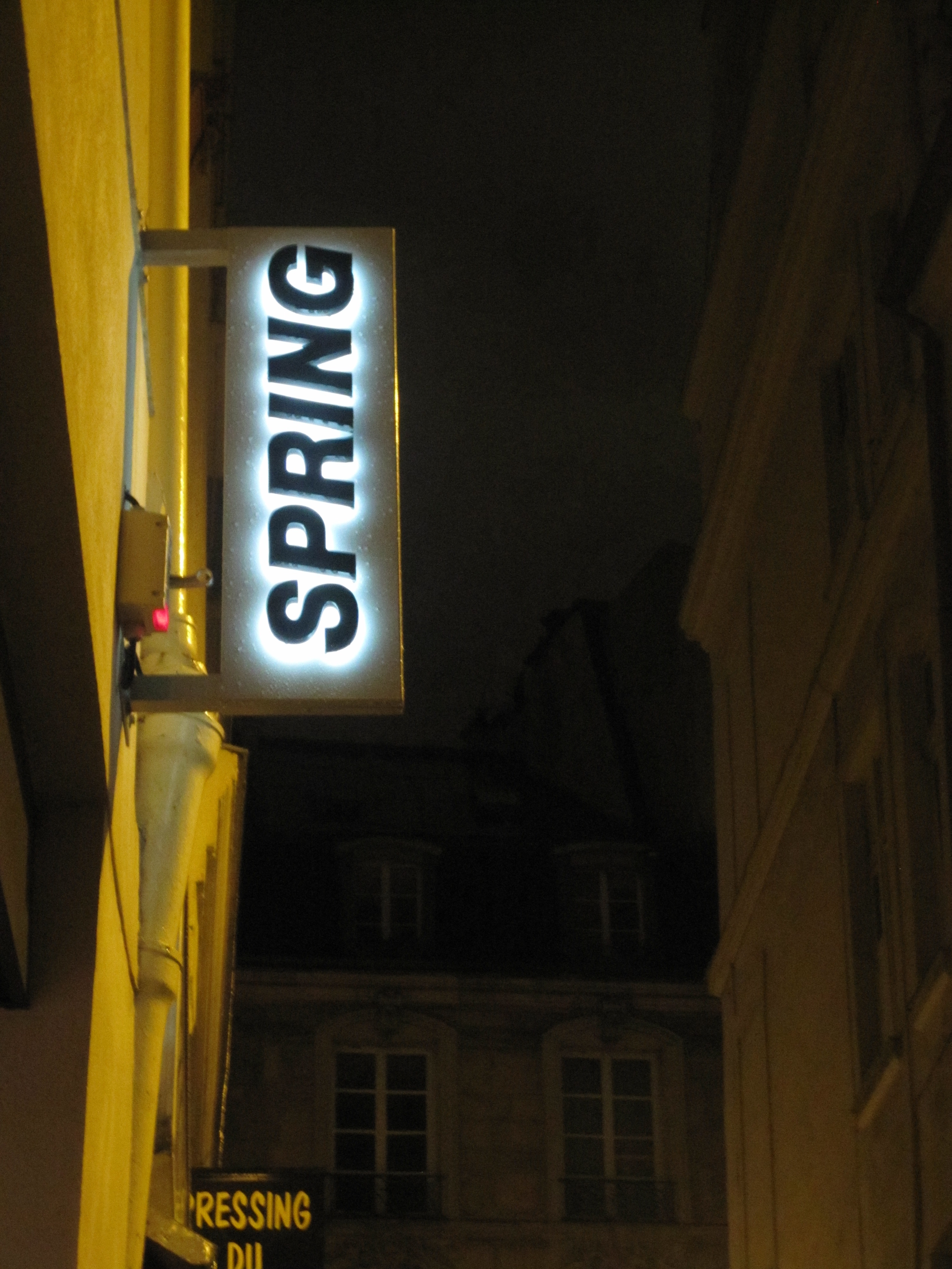 Anyway, we used to hang out there a lot. The booze is ridiculously cheap for the neighborhood, and if you get there early enough you can snag a booth to while away the evening. I live for bargain beers and booths. We never saw John Galliano there, though there was always the possibility that he might be around, as it is the watering hole for all the local designer ateliers. I find the description of La Perle as “a neighborhood bar” in the New York Times rather laughable, as I’ll bet you ninety-six percent of the people that go there don’t live within a twenty-block radius of the place. (Did that sound smug? I didn’t mean it to.) In fact, I’ve bristled at most of the characterizations of the Marais that have accompanied news coverage of the Galliano event. Yes, of course this neighborhood is filled with gay bars and fancy clothing stores and falafel joints. But it’s not even faintly dangerous, nor soulless, nor hopelessly bourgeois. It’s my wonderful, weird neighborhood, one I feel more attached to than anywhere I’ve lived in recent memory. That is to say, I definitely feel like a Maraisienne these days than anything else, and you better watch what you say about my beloved marsh. Thems fightin’ words.