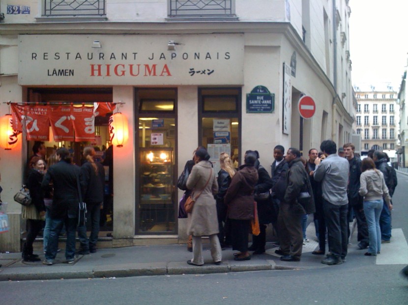 My friend S (now temporarily bereft of H) had highly recommended Higuma as he often frequents it when he stays in a gorgeous apartment owned by family friends on the same block (color me virescent with drooling envy). Sainte Anne is packed with terrific-looking sushi and noodle shops, many of which attract lines that would suggest that good cooking is afoot. The line is always longest at Higuma, however: