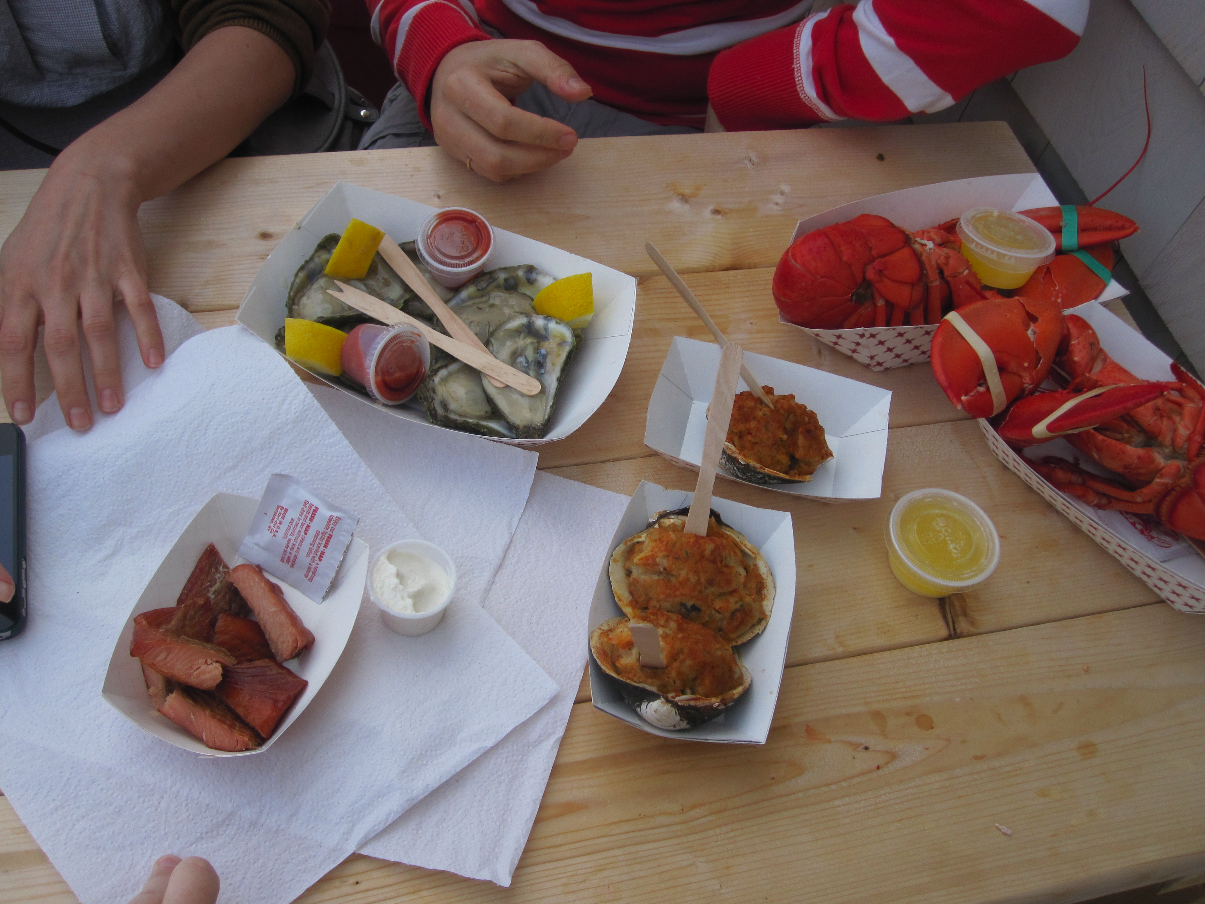 But we weren’t done! Oh no, we were definitely not done in Clarence’s crusade to eat every single crustacean and bivalve on the eastern seaboard. Graciously, A took a day off from work the week before finals (!) and the three of us drove up to Rockport, Massachusetts for ocean gazing, beach walking, and knickknack shopping. Scenery aside, our main objective was lunch at Roy Moore Lobster Co. (39 Bearskin Neck, Rockport, MA 01966, 978.546.6696). If you’ve ever watched a Red Lobster commercial late at night and felt an elemental pang of longing for the red flea (not from Red Lobster, obviously, but these commercials do seem to be my trigger), this is your Valhalla. Lunch was stuffed clams, smoked salmon with horseradish cream, freshly-shucked Wellfleet oysters, and the two most beautiful lobsters I’ve ever seen, all for a price that made me say “No seriously, how much did that actually cost?!”