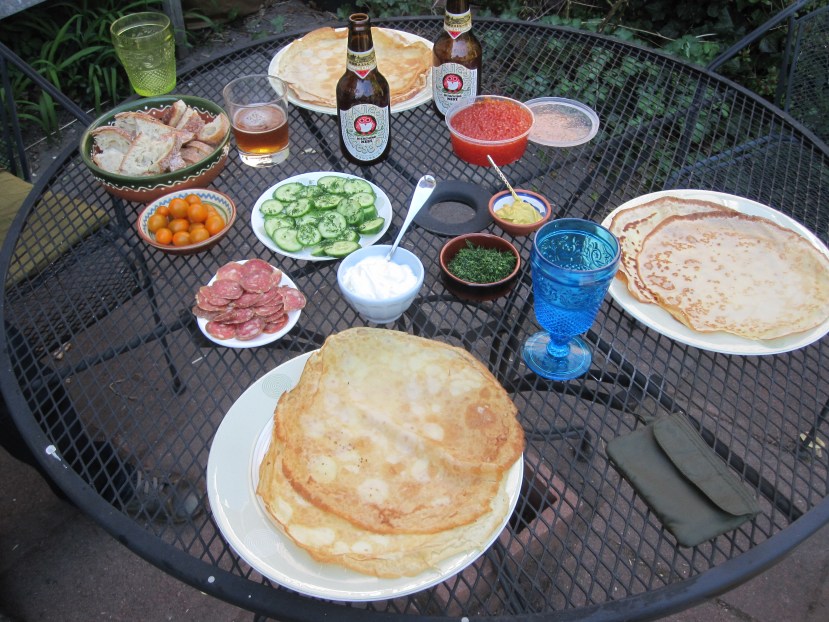 You arrive at her house for a visit, and a “casual lunch on the patio” consists of red caviar and blinchiki (Russian crêpes), festooned with sour cream and fresh dill. Oh, and a perfect salad of fresh radishes, green onions, and cucumbers. Side effects of caviar-on-landing may include weakness in the knees, but Japanese beer is a good remedy for that.