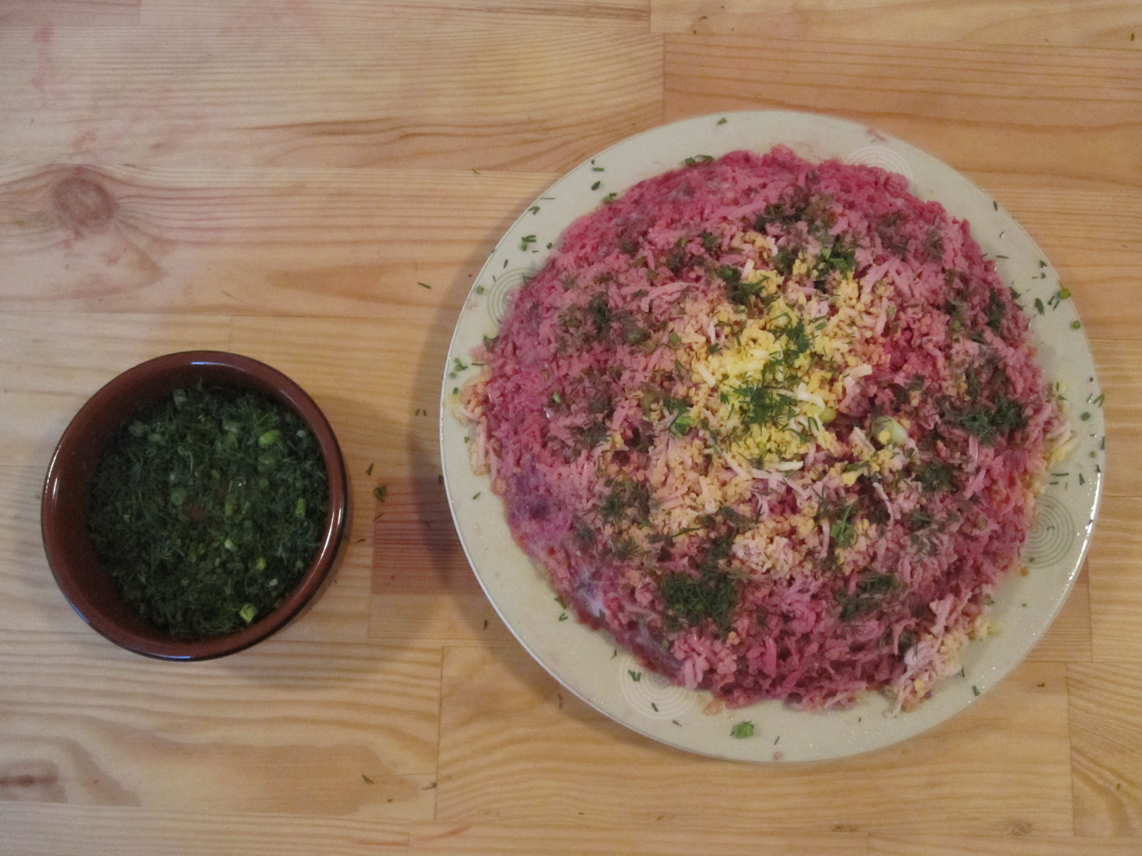 Have you found the love of a Soviet Jew? Then lunch the following day will probably be shuba, that fuchsia salad of Eastern-European Jewish diaspora, made of salted herring, potatoes, carrots, beets, onion, hard-boiled eggs, mayonnaise, and dill. My Soviet is an expert at using the smallest amount of mayonnaise humanly possible, so her shuba never gloppy. Side effects of shuba-love may include eating beets for breakfast and excessive bragging on your blog.