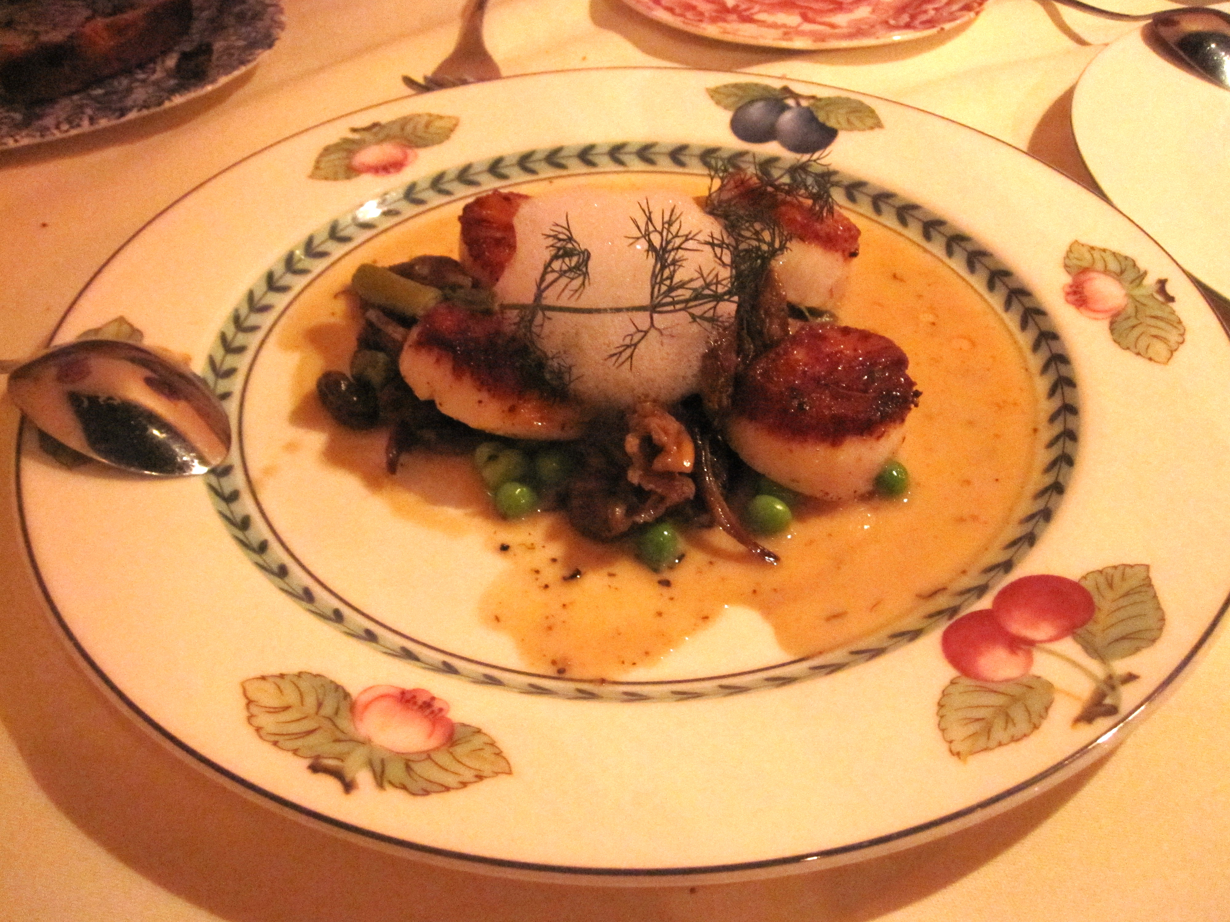Scituate scallops with sorrel, yellowfoot mushrooms, Georgia sweet peas, pickled radish pod, and sage froth