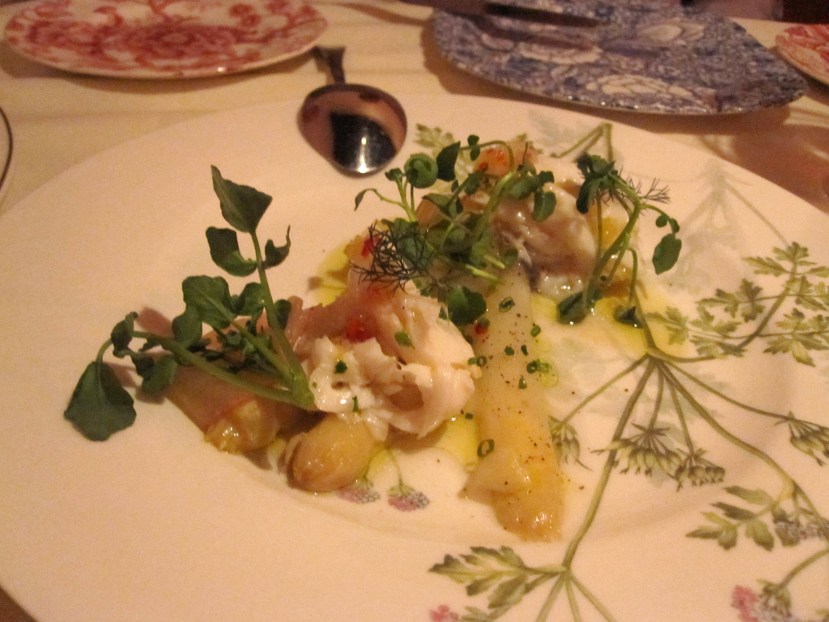 French white asparagus salad with wild Westport watercress, lemon-chili vinaigrette, pickled rhubarb, lemon verbena, and olive oil-poached Day Boat halibut