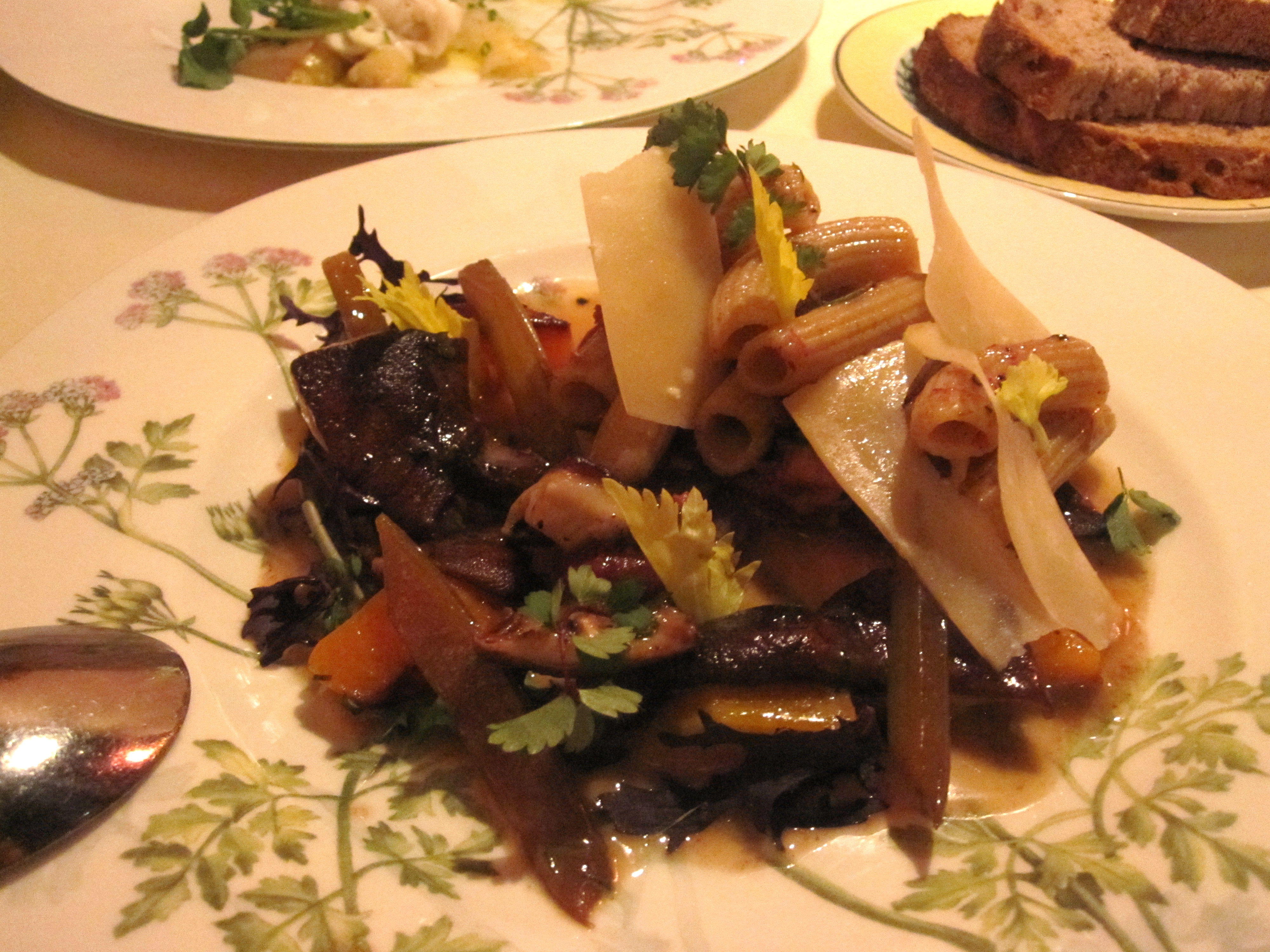 Red wheat rigatoni with braised beef shank, shiitake mushroom, butternut squash, Pu-Erh celery baton, and Parmigiano Reggiano