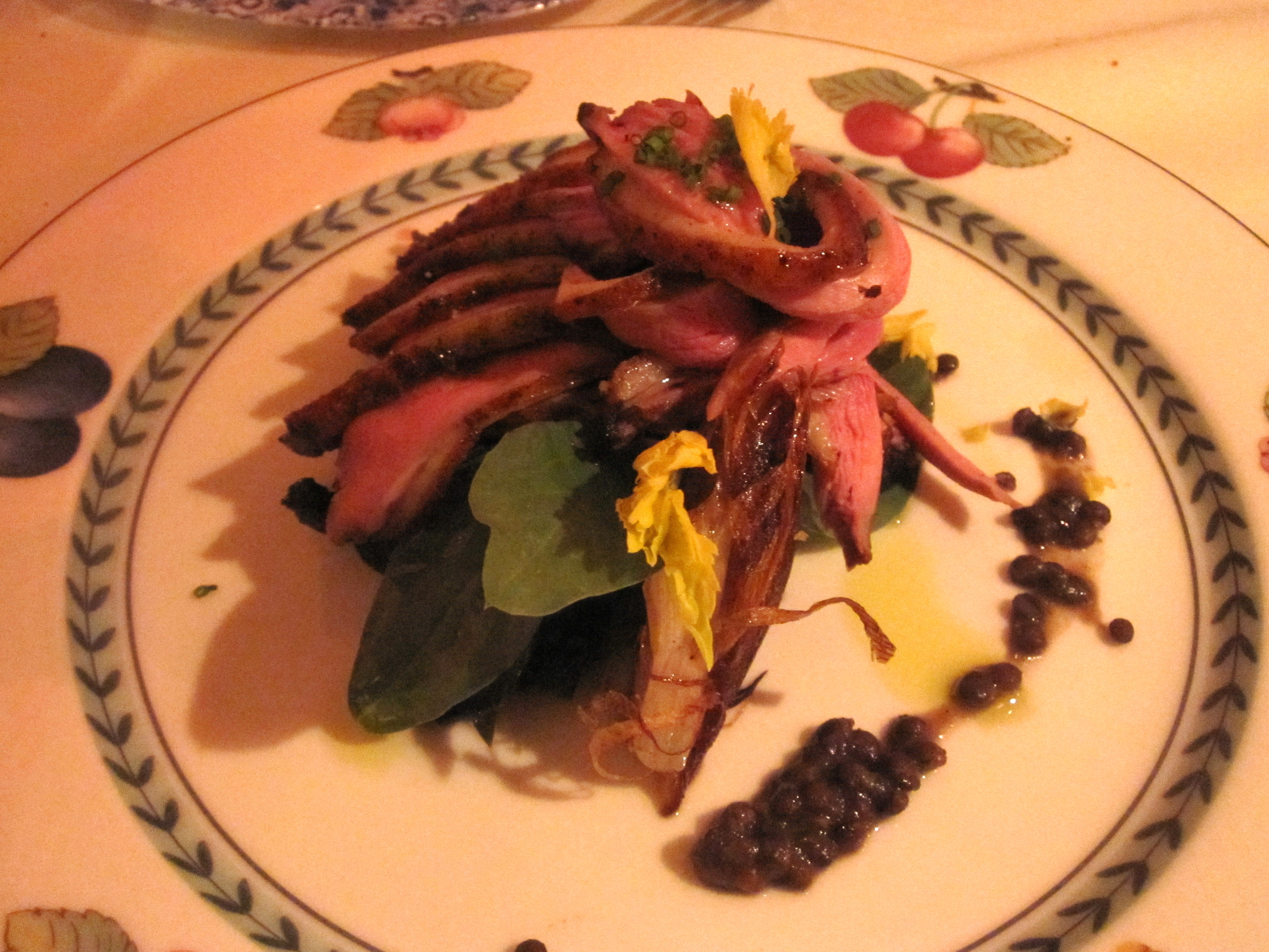 Rouen duck breast with Rhode Island white flint cornmeal cake, young onion greens, collard greens, and red wine black lentils