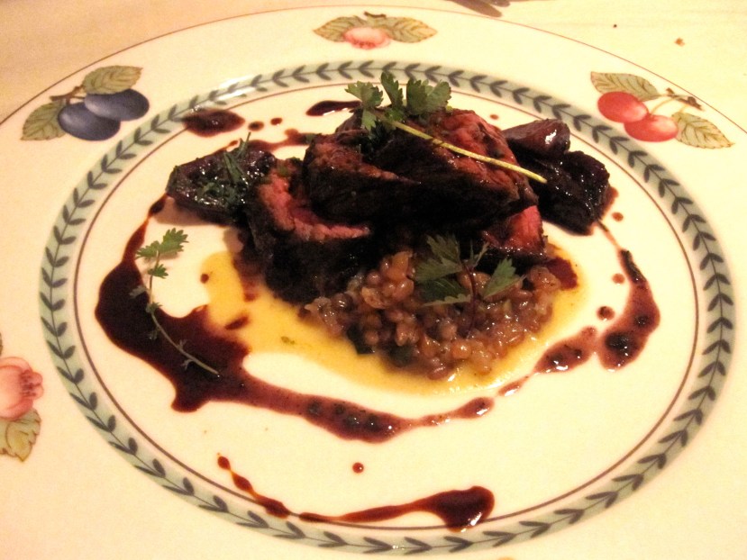 Angus beef bavette with red wine braised root vegetables, rye berries with crème fraîche, and roasting jus