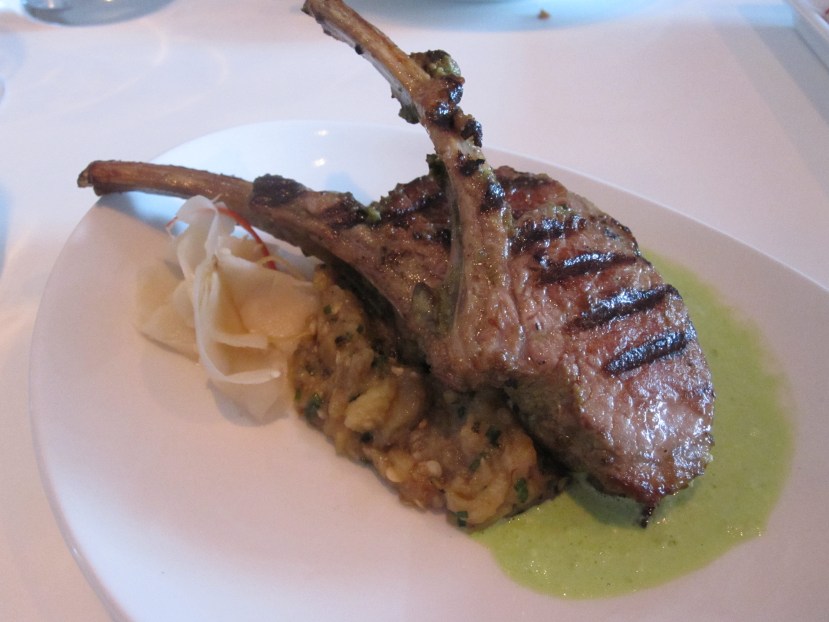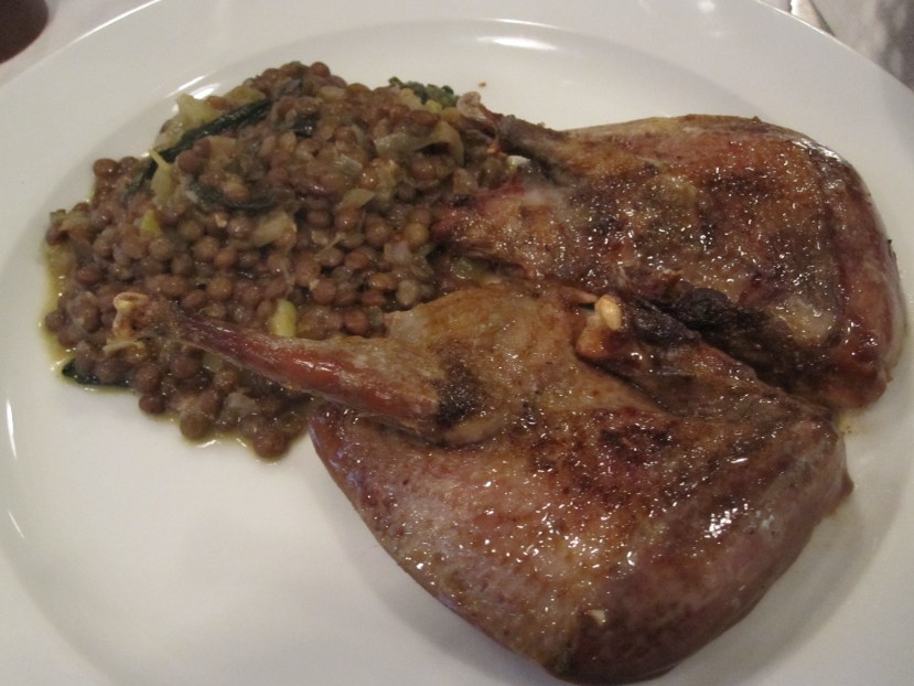 Our main courses were roasted lamb and fennel, which was quite possibly one of the most amazingly gamey-while-delicious cuts of meat I’ve ever encountered and pigeon with lentils (slightly bloodier than I usually like my pigeon, but maybe I’m in the wrong on that one). Either way, both were completely amazing, if a total departure from the oft-fussiness of high-end Parisian cuisine.