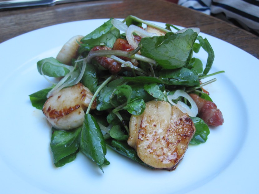Our third night, we followed the “St. John diaspora” (snort) and decided to try Hereford Road (3 Hereford Road, Subway: Notting Hill Gate), a relatively new space from the former chef at St. John Bread and Wine, Tom Pemberton. I’m going to just go ahead and say it: we liked it even better than St. John. The space is beautifully designed with an enormous circular skylight in the main dining area. The staff is thoughtful and articulate about the food and wine. And the food, while simple and unfussy, is gutsy and delicious and traditional while also being totally out-of-the-box. To start, Mama L had an exquisite spinach, bacon, and seared scallop salad. Don’t you love it when a simple scallop screams “Whoever cooked me is a total artist!”? I sure do: