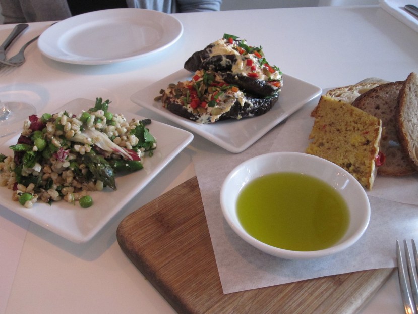 The dinner menu at Ottolenghi is made of two sections: from the counter and from the kitchen. Everything is a small plate meant to be shared, and the servers recommend that you order a mix of plates from the counter (usually cold, and served more or less immediately) and from the kitchen (hot dishes that take a little bit longer to arrive). Our server recommended five dishes between two people, which was exactly the perfect amount with dessert. Our dishes from the counter were barley and farro with asparagus, feta, preserved lemon, green peas, and pink peppercorn (left) and roasted aubergine (eggplant) with apricot and ginger yoghurt, spiced pumpkin seeds, chili and sumac (right), served with the most orgasmic selection of bread I’ve seen in awhile: