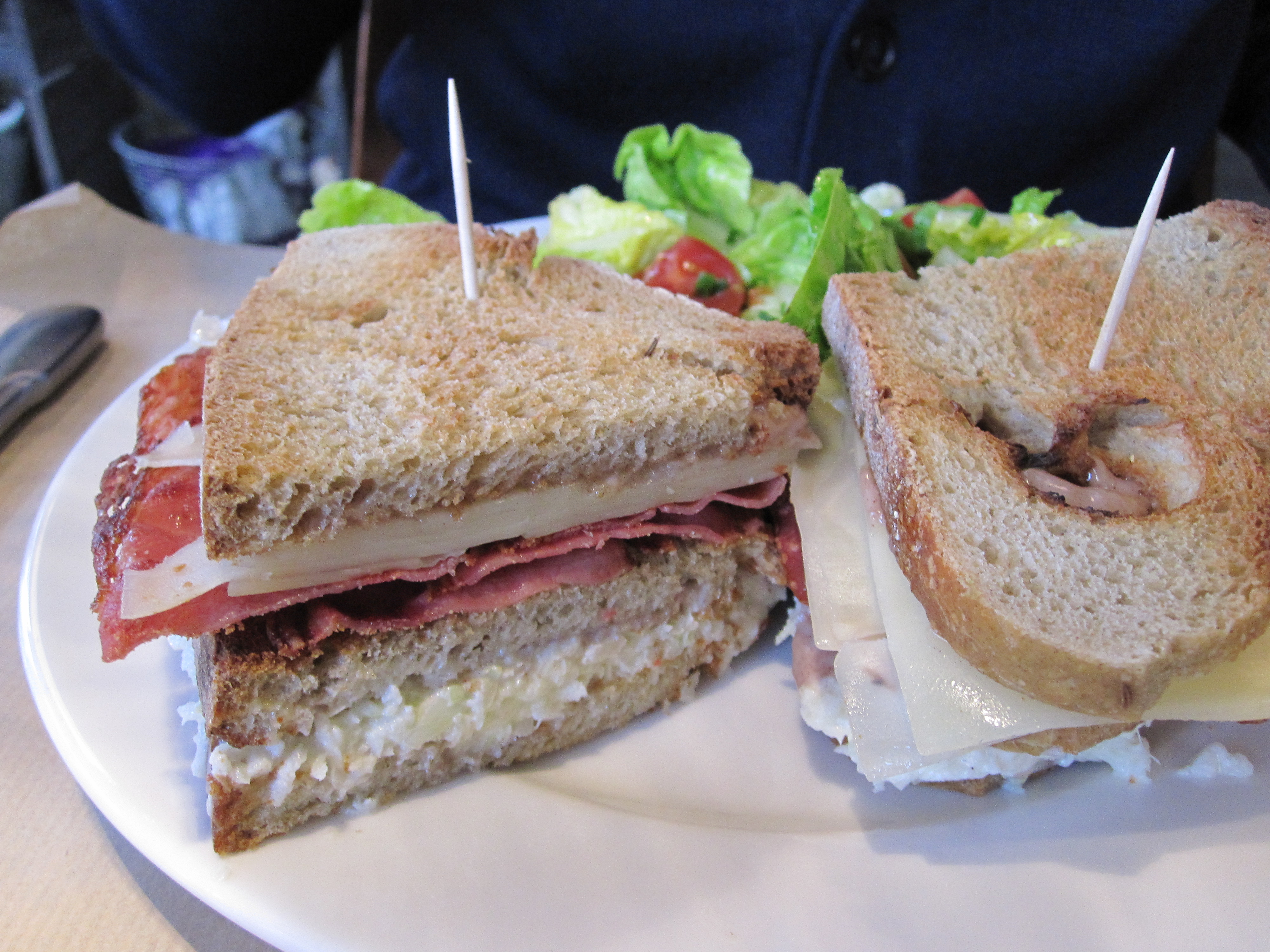 Their menu features another traditional English breakfast (this time with oven-roasted tomatoes and some dreamy sausages in addition to the bacon), eggs Benedict, and an assortment of nice sandwiches. B sampled their Ruben, which isn’t really a Ruben in any classic sense of the word and needs about triple the pastrami and some proper sauerkraut. Not that anyone with any decision-making ability in such things is reading this, but if they were, there you go.